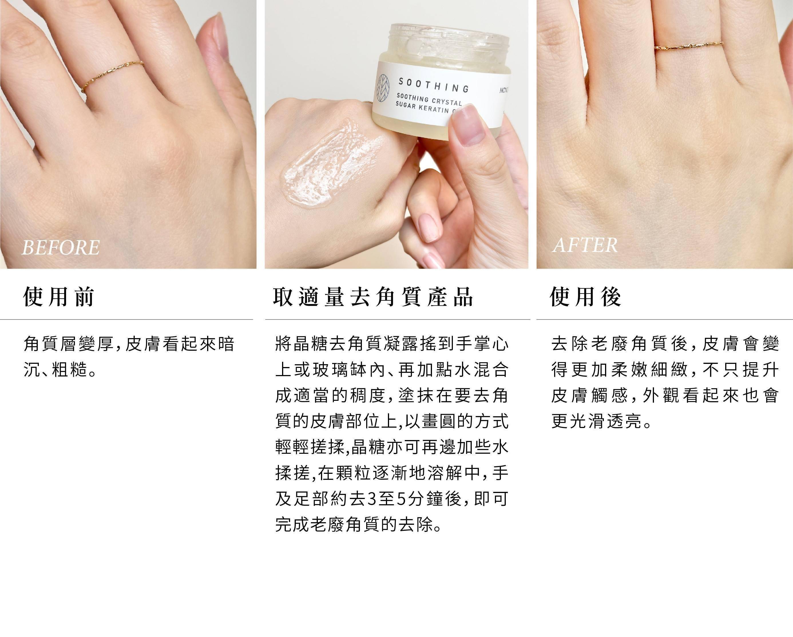 如腋下、胸部、手肘、手臂、膝蓋、臀下、胯下、曬痕、色差處,均可舀出 1/3 匙的晶糖在缽內或手掌上,加約 5滴水及 1.5~2滴的淨白精華液,一起混合拌勻後開始去局部角質。約 輕揉搓停留6-10分鐘後再洗拭,效果更佳。
